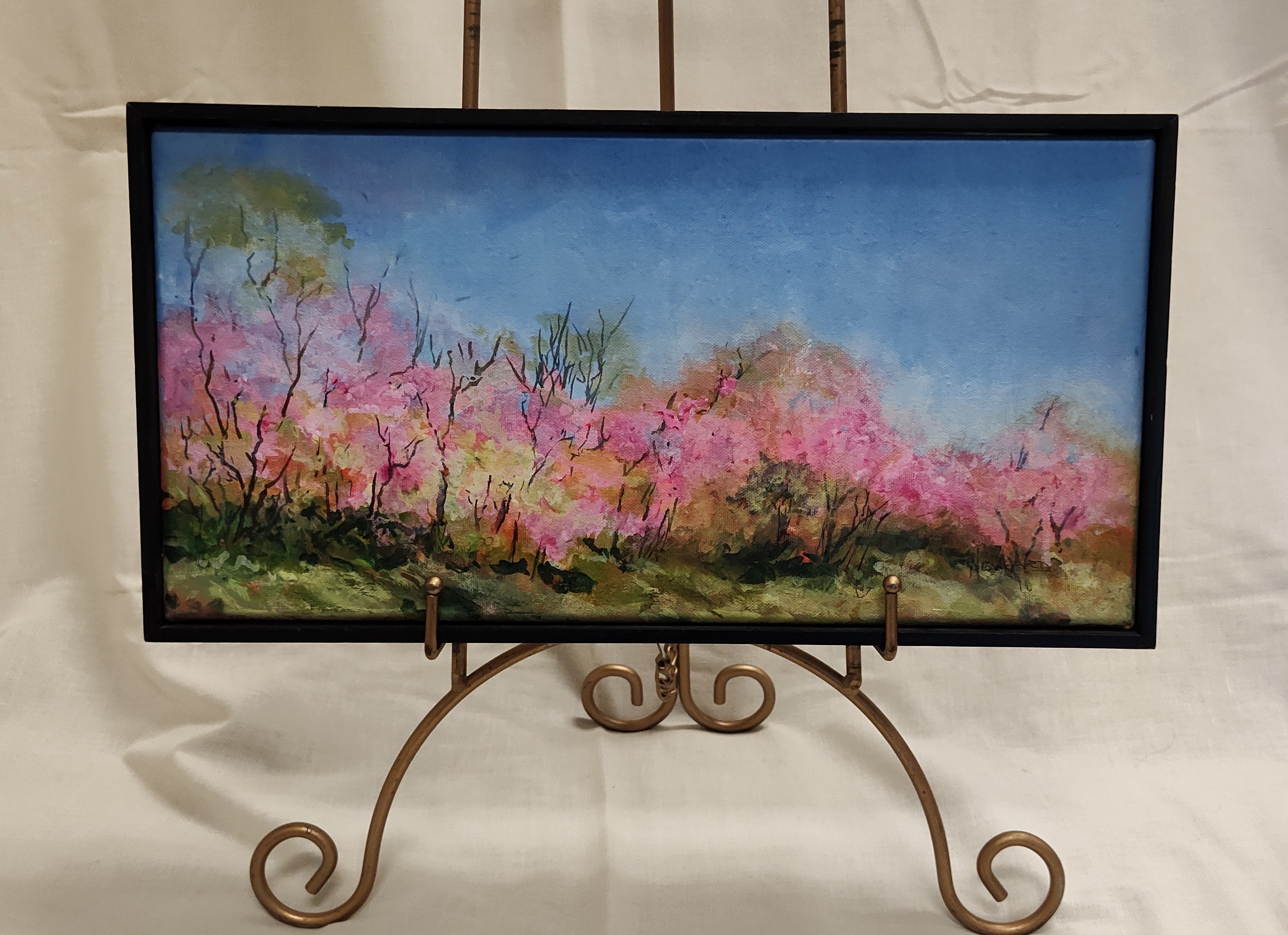 “Hot Springs Redbud” by Nancy Newhard. 9″ X 16.6″ Acrylic Painting.