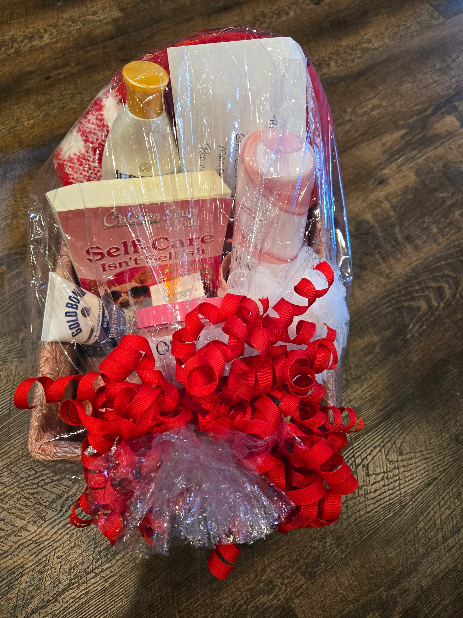 Included: Mani-Pedi Gift Certificate from Rustic Elegance, Body Wash, Sponge, Body Cream, Throw, Fuzzy Socks, Candle, Cup, and Tea.