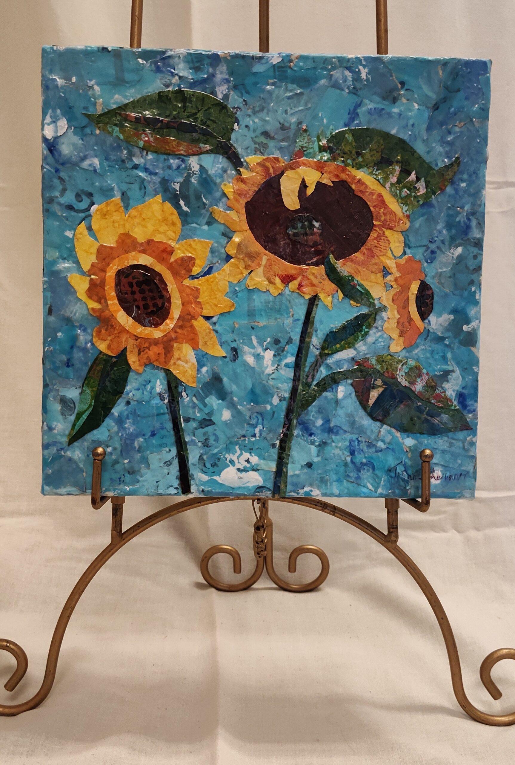 “Sunflowers From the Garden” by Judith Lochbrunner. 10″ X 10″ Painted Paper Collage.