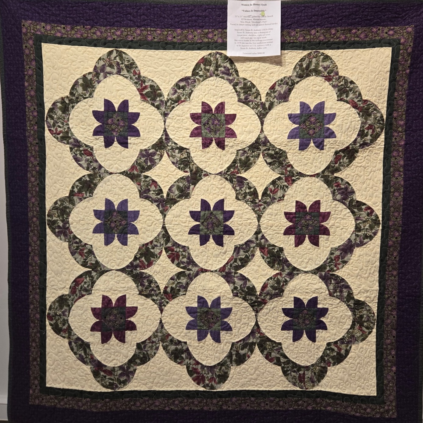 53″ X 53″ Women in History Quilt machine quilted by Candy Jewell of Belmont, Massachusetts, and donated by Libby Burger.